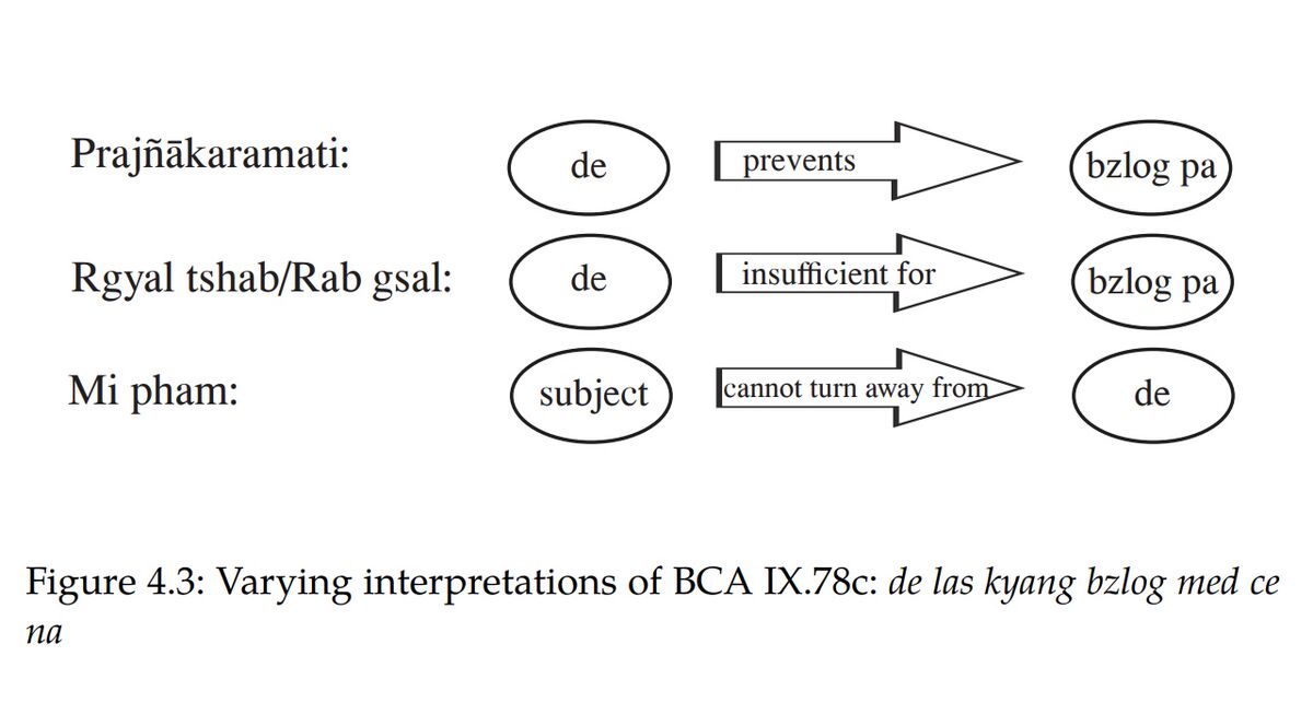 While Rgyal tshab shares Prajñākaramati's basic grammatical construction of the verse line, in the sense that for both scholars, the ablative case ending – or the particle las in Tibetan – indicates a reason, he has a different understanding of the content of this reason. According to Rgyal tshab the pronoun "that" in BCA IX.78c must be read as "the averting of the delusion of a self." In this interpretation, the opponent in the BCA concedes that it is possible to avert the delusion of a self, but counters that such does not suffice for averting "grasping as truly [established]" (bden 'dzin), which is seen as the cause for suffering. Unlike Prajñākaramati, for whom "that" refers to "seeing a self" (ātmadarśana) as the active cause that prevents averting egoism (ahaṃkāra), Rgyal tshab explains the pronoun as an antidote to the delusion of a self, which, however, does not constitute a sufficient cause for averting another kind of grasping, namely grasping phenomena as truly established. . . .